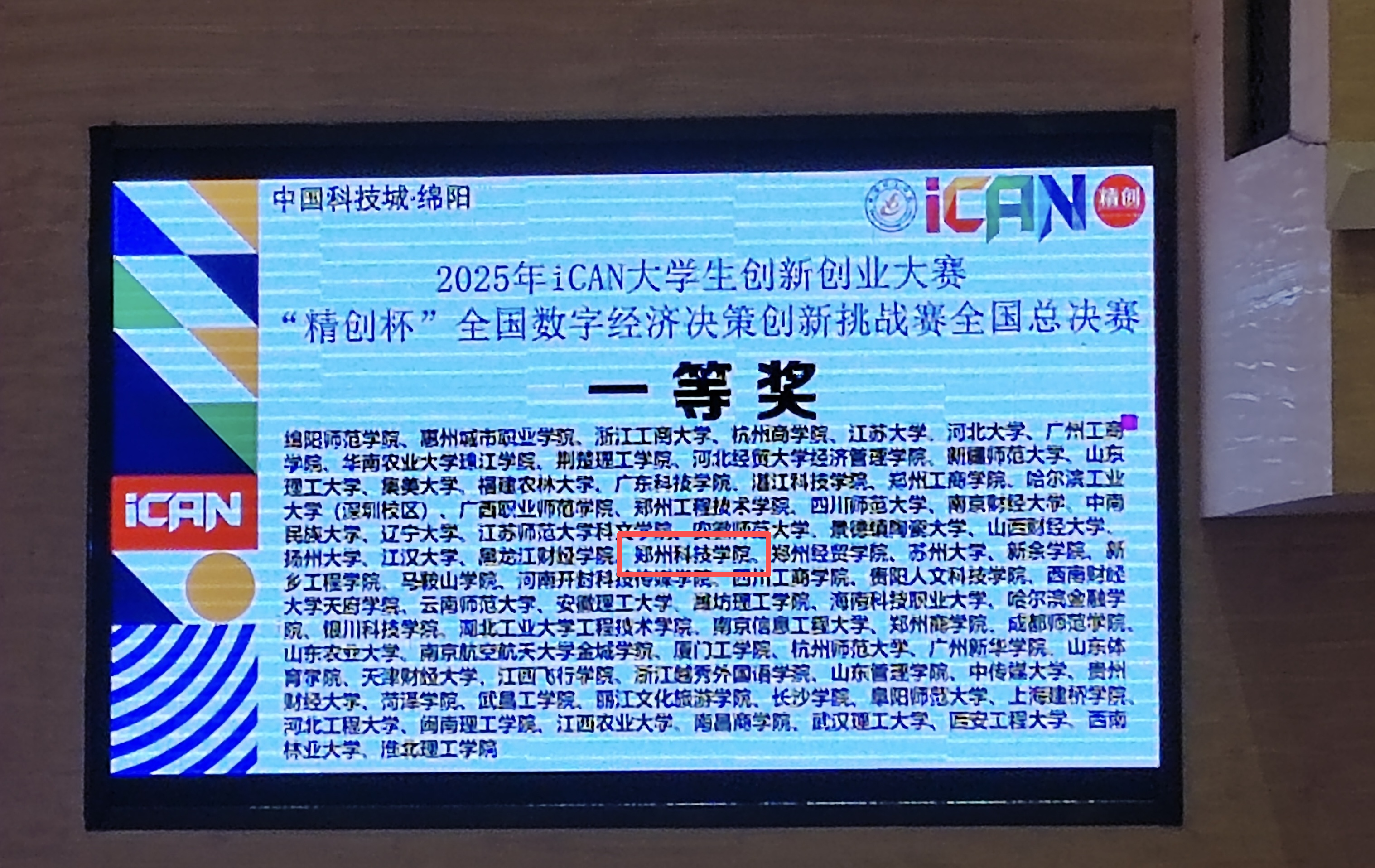 大河网讯 11月23日,2025年iCAN大学生创新创业大赛“精创杯”全国数字经济决策创新挑战赛全国总决赛落幕。郑州科技学院财经学院参赛团队表现优异,斩获一等奖。学校同步获评“优秀组织奖”,全国仅25所高校获此嘉奖。
