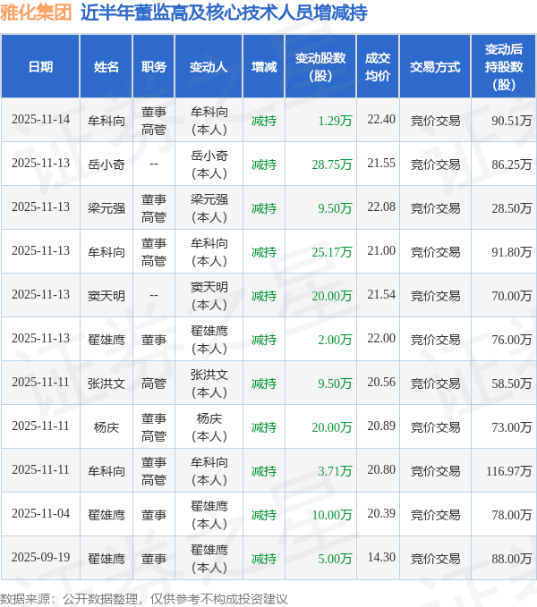 雅化集团近半年内的董监高及核心技术人员增减持详情如下:
